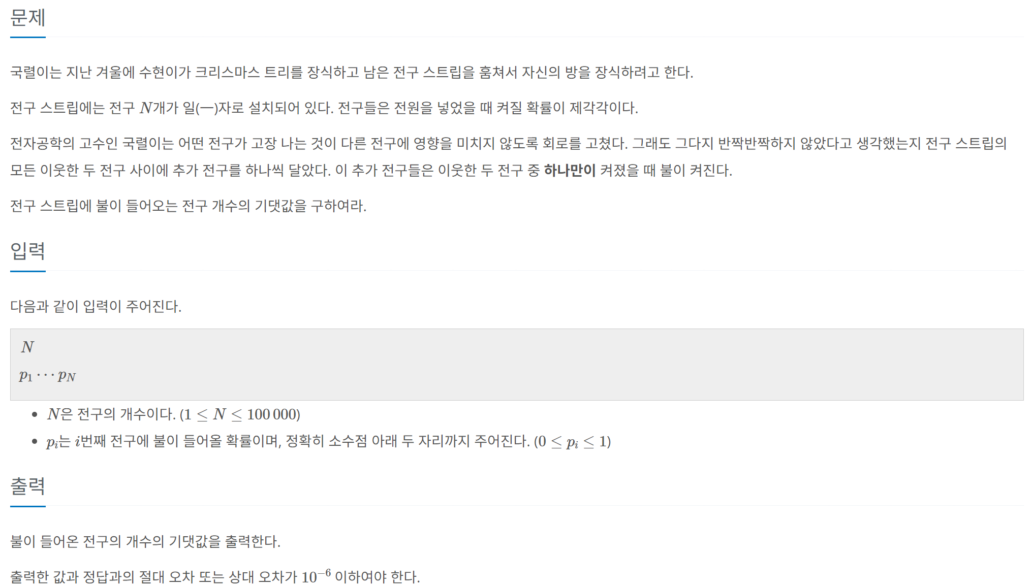 각 전구 별로 켜질 확률을 전부 따로 계산한 후 전부 더해서 답을 구했다. 자연스럽게 확률과 통계에서 쓰던 사고 방식이 기댓값의 선형성이라는 알고리즘이었다. 풀이 자체는 어렵지 않았는데 나는 소수점에 맞춰서 출력해야 되는 것 때문에 애를 먹었다. cout을 통해 실수 자료형을 출력하면 (정수 부분 + 소수 부분)이 6자리로 출력된다고 한다. 그래서 그냥 제출하면 틀린다. (오답) cout의 출력 자릿수를 고정해주는 코드를 추가하여 맞을 수 있었다. (정답)
