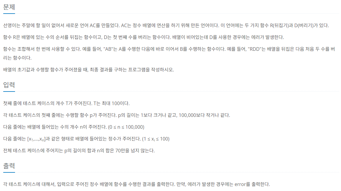 [C++] AC (백준 5430번) 본문