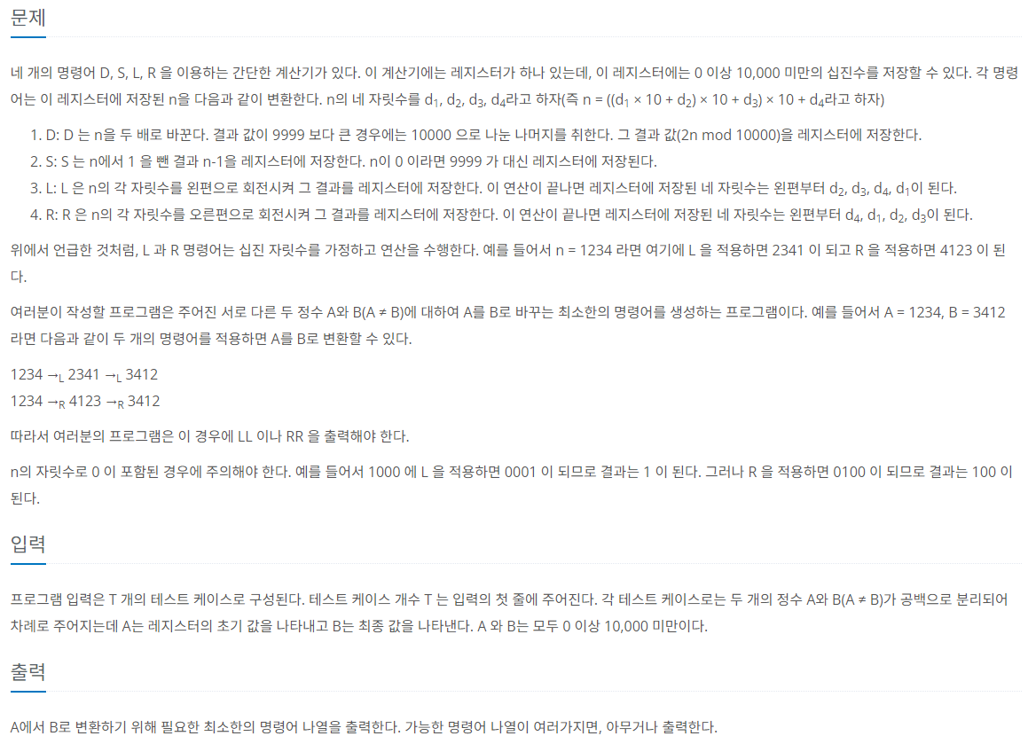 문제를 어떤식으로 풀어야 하는지 감이 안 잡혀서 태그도 까고 구글링으로 힌트도 좀 얻었다. 너비 우선 탐색으로 상하좌우로 움직이는 전형적인 문제들과 비슷하게, 너비 우선 탐색으로 D, S, L, R 연산을 하면서 결과를 만들어 내면 된다. 너비 우선 탐색을 해야한다는 것과 각각의 결과에서 D, S, L, R 연산을 수행할 수 있다는 것만 알면 쉽게 풀 수 있는 문제였다. 그걸 떠올리는 게 어려웠지만.. (AC)