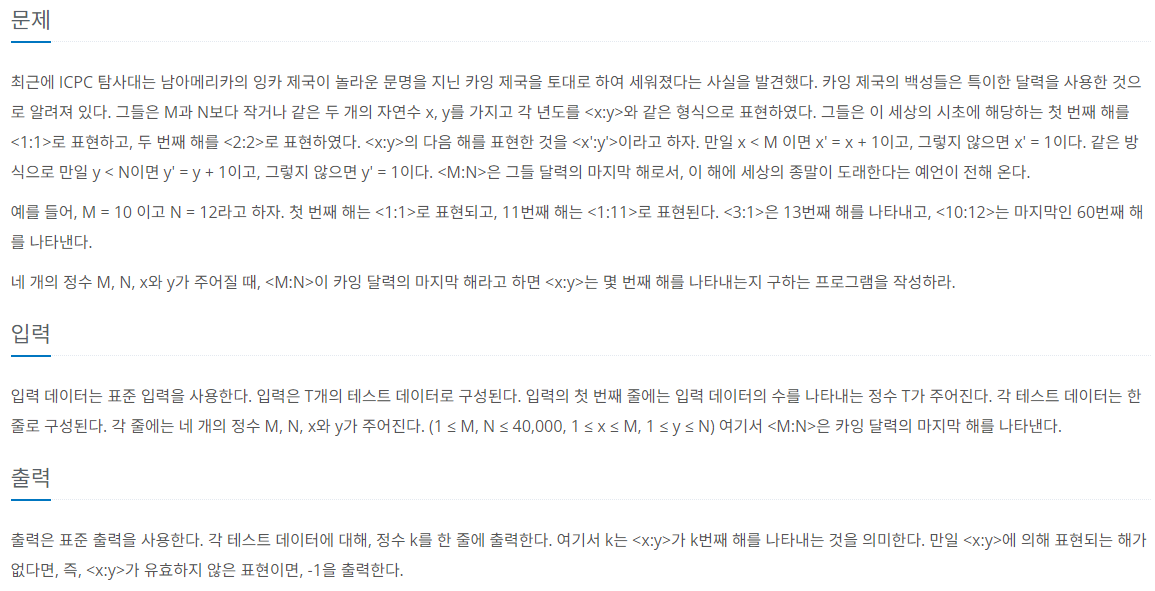 여기서 a와 b는 어떤 수가 와도 상관이 없다. 다시 말해, k - x가 m으로 나누어 떨어져야 하고, 동시에 k - y도 n으로 나누어 떨어져야 한다. 그래서 나는 a를 0부터 40000까지 하나씩 대입해보면서 가능한 k가 있는지 찾았다. 찾아지면 그 즉시 종료하고, 40000까지 대입해봐도 찾을 수 없었다면 -1을 출력한다. (AC)