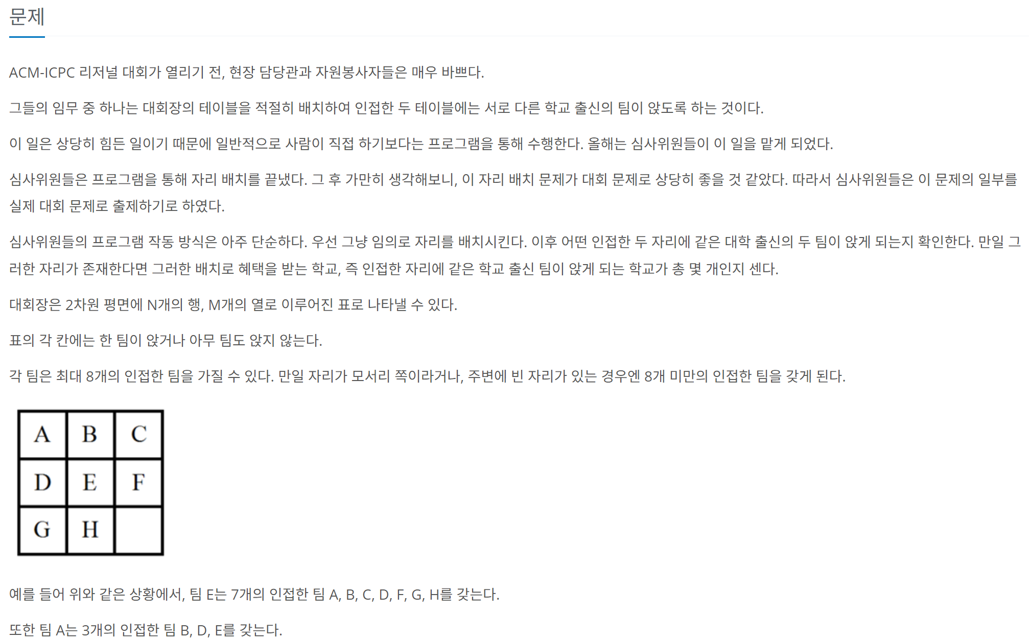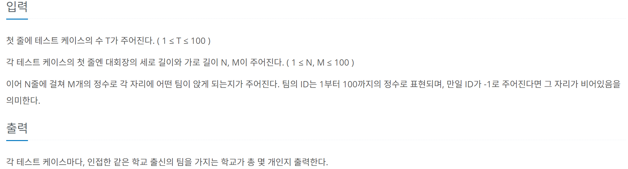문제에 명확히 나와있지는 않은 것 같으나, 팀 ID가 같으면 같은 학교 출신으로 생각하는 것 같다. 팀 ID는 1부터 100까지 가능하므로 bool 배열 chk[101]를 false로 초기화해뒀다. 그리고 자리 배치표에서 한칸 한칸 확인하며 이미 chk가 true이면 확인할 필요가 없고 chk가 false이면 주변 여덟 자리를 살펴보며 같은 ID가 있는지 확인한다. 만약 있다면 그 즉시 chk를 false로 바꾸고 break한다. (AC)
