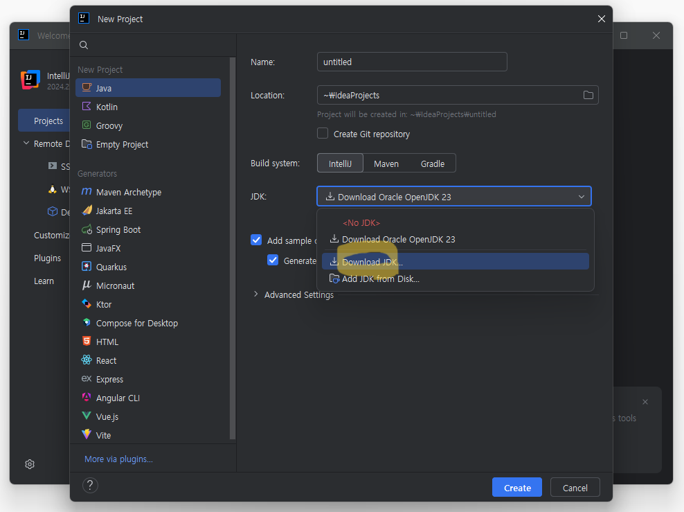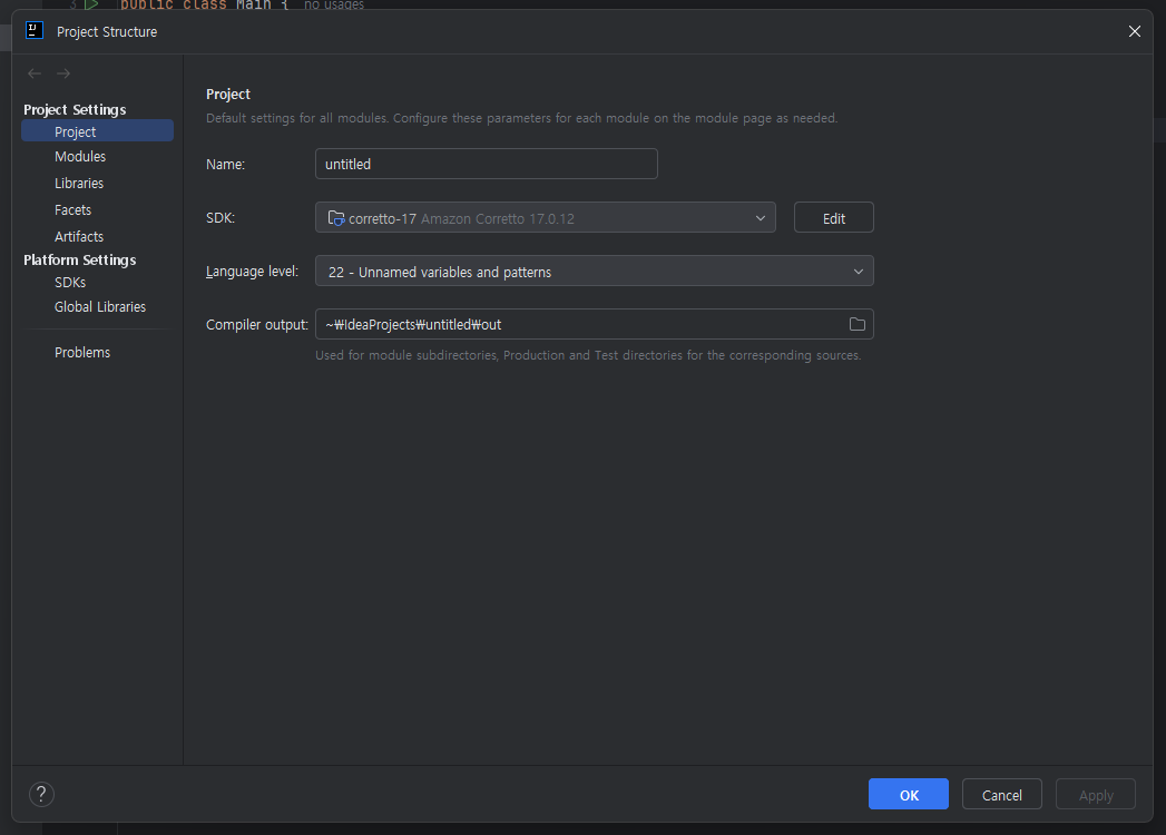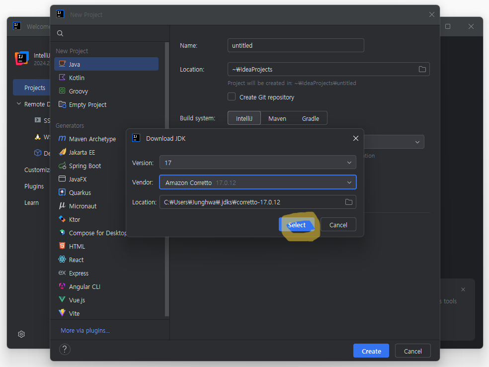 프로젝트 생성해주면 자바 17 다운로드도 된다.