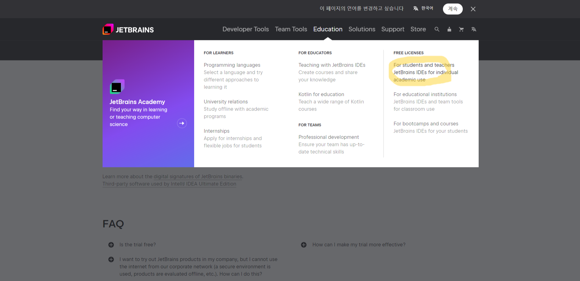추가로, 학생 라이선스 발급은 여기서 하면 된다.