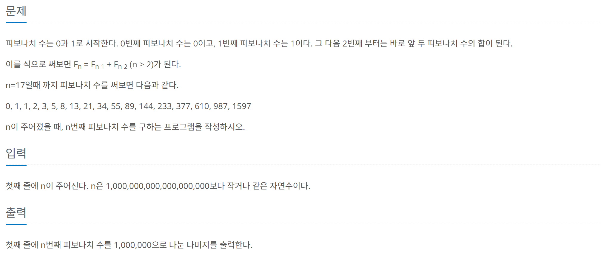 주의할 점은 어차피 1,000,000의 나머지이기 때문에 fib 배열의 타입은 int로 해도 되지만, 마지막에서만 M으로 나눠주면 오버플로우가 날 수 있기 때문에 fib[i]를 계산할 때마다 나눠주어야 한다. 또 당연한 거지만 입력받을 때 n을 long long으로 입력받아야 한다! (AC)