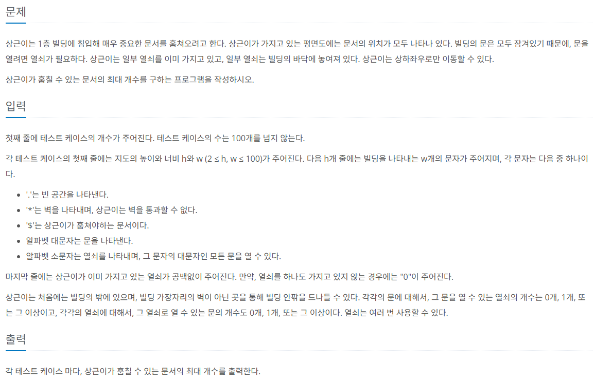 // 입력 받으면서 빈칸 혹은 열쇠가 있는 칸 혹은 문서 있는 칸 체크 (시작할 수 있는 지점)
