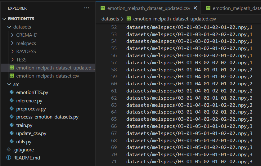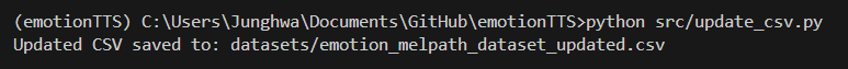 update_csv.py 파일을 실행시켜 emotion_melpath_dataset.csv에서 .wav 파일 경로를 .npy 파일 경로로 업데이트하여 emotion_melpath_dataset_updated.csv라는 새로운 파일로 저장해준다.