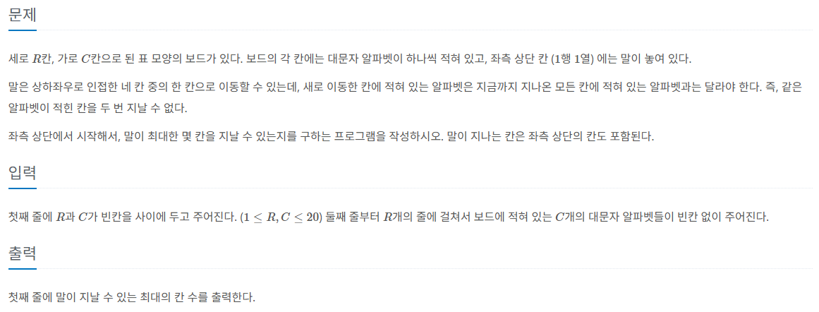 전형적인 dfs 문제였다. 알파벳 보드 m 배열과 해당 알파벳을 방문했는지 여부 vst 배열 등을 전역으로 정의한다. dfs 함수에서는 상하좌우로 움직이면서 vst 배열을 체크하고 만약 갈 수 있다면 해당 알파벳의 vst를 true로 만들고 dfs 함수를 호출 후 다시 vst를 false로 만드는 식으로 구현했다. (AC)