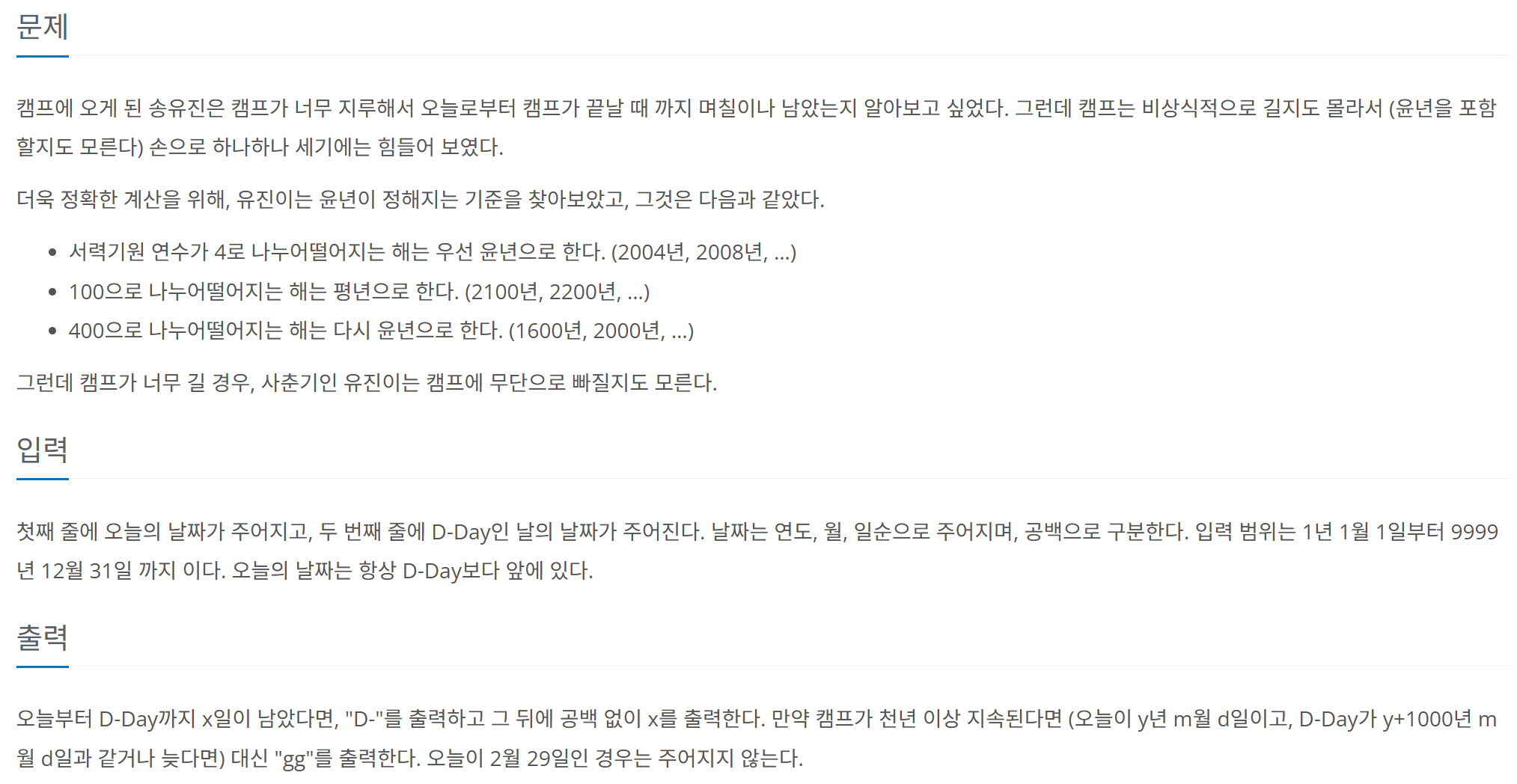 이 문제에서 헷갈릴만한 건, 천년 이상이라는 게 연도의 차이는 1000 이상이면서 달도 크거나 같고 일도 크거나 같아야 한다는 것이다. 즉, <2000년 1월 1일, 3000년 1월 1일>은 gg가 맞지만, <2000년 1월 2일, 3000년 1월 1일>은 gg가 아니라 계산을 해주어야 한다는 뜻이다. (AC)