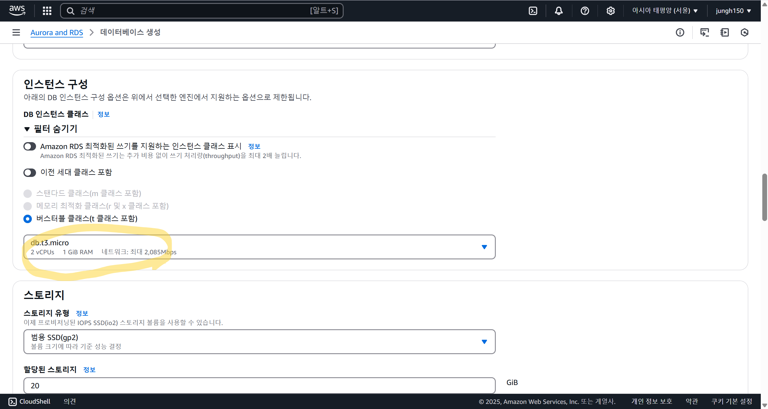 인스턴스 구성에서 db.t3.micro로 설정해준다.