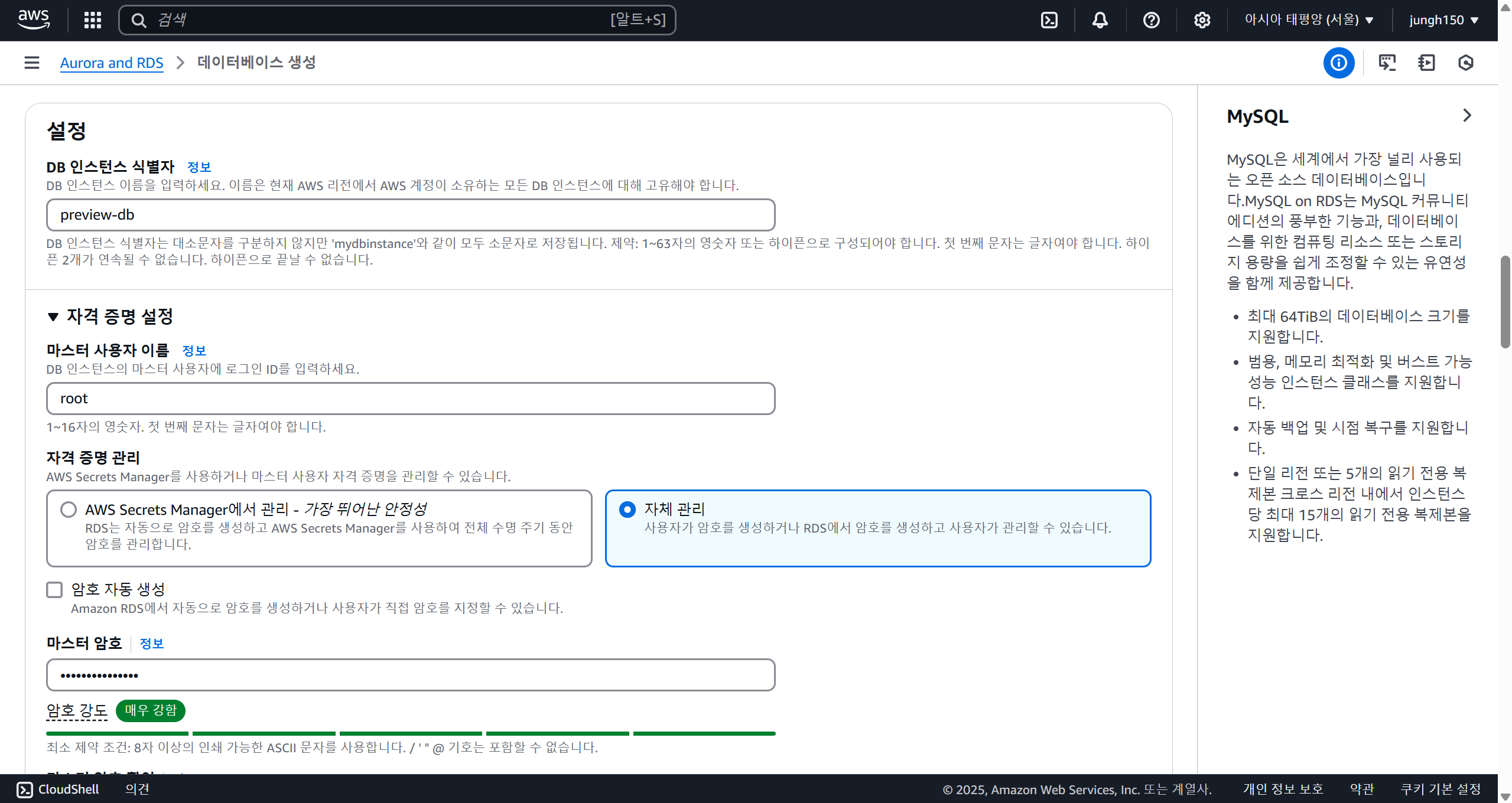 나는 자체 관리를 선택했고 암호도 직접 지정하였다.