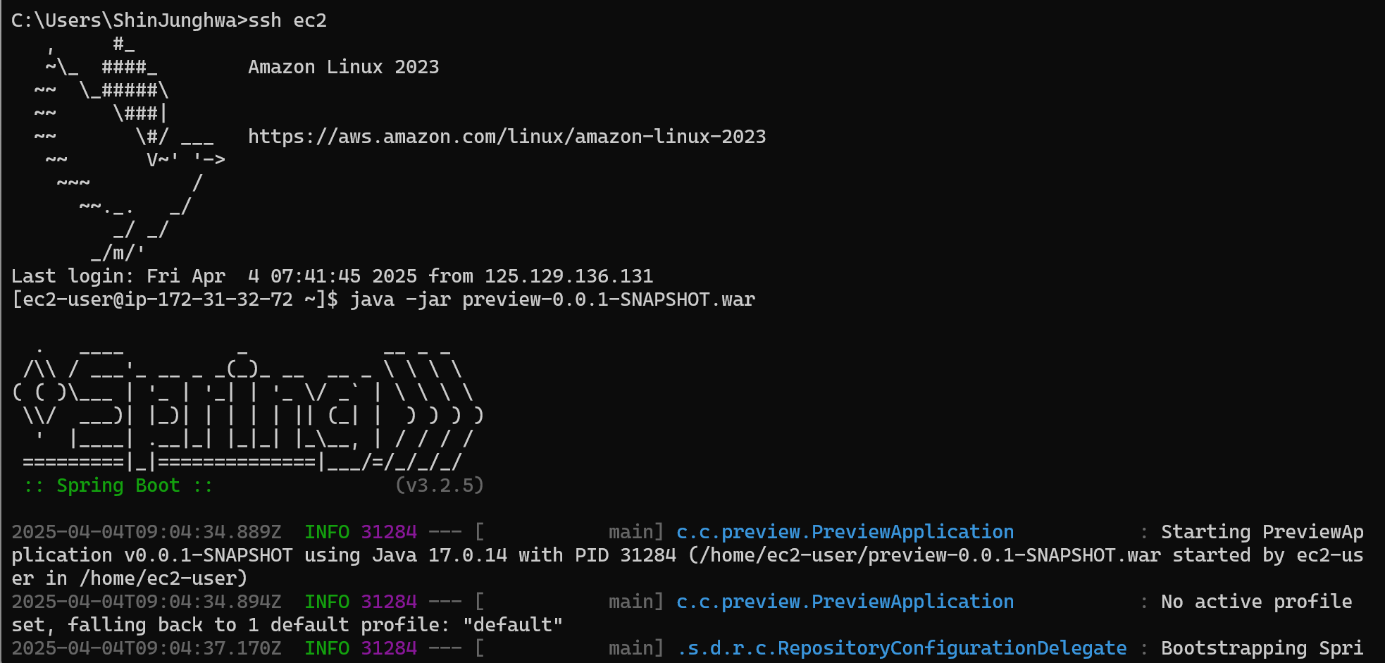 참고로 키 페어는 C:\Users\ShinJunghwa\preview-key.pem 에 두었다.