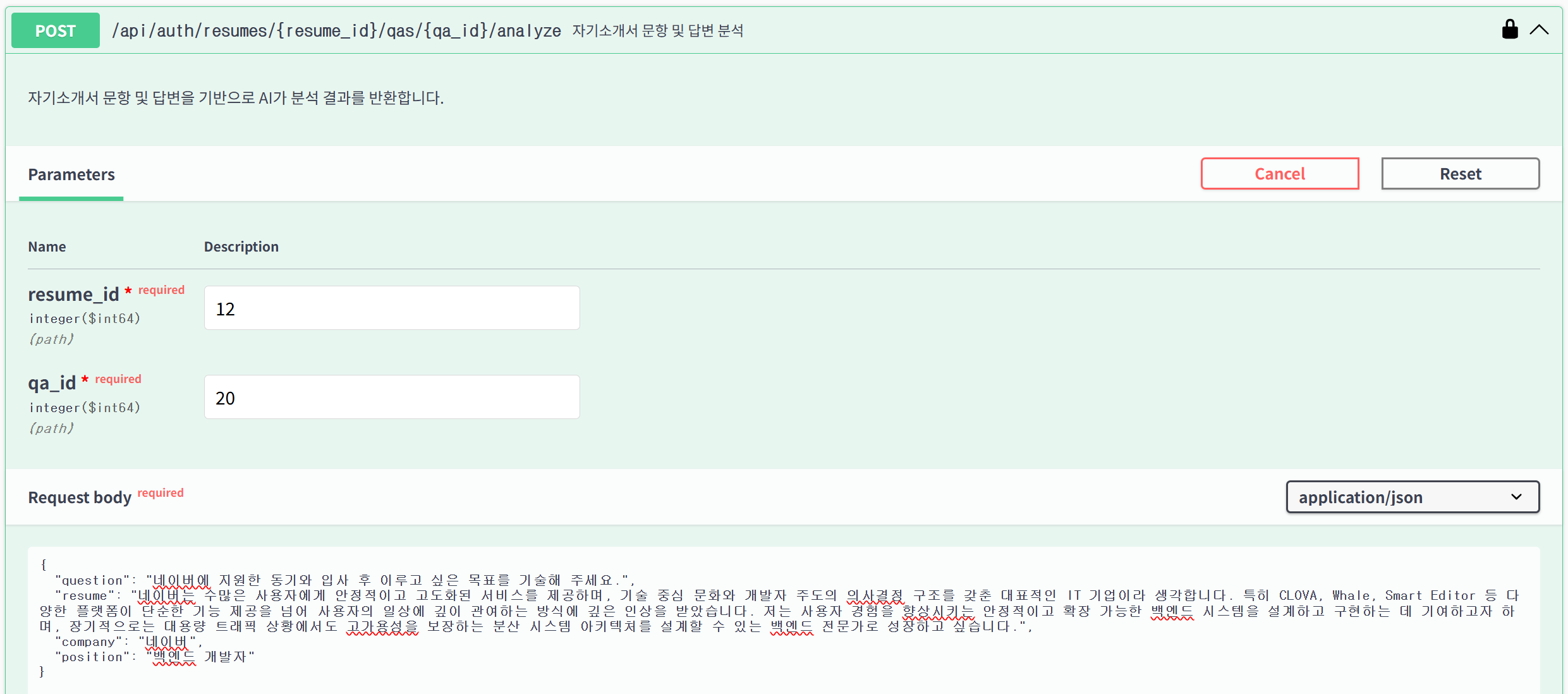 백엔드 서버 쪽에 API 요청을 보냈을 때 AI 서버와도 잘 연동되어 자기소개서 분석 결과가 나오는 것을 확인할 수 있다.