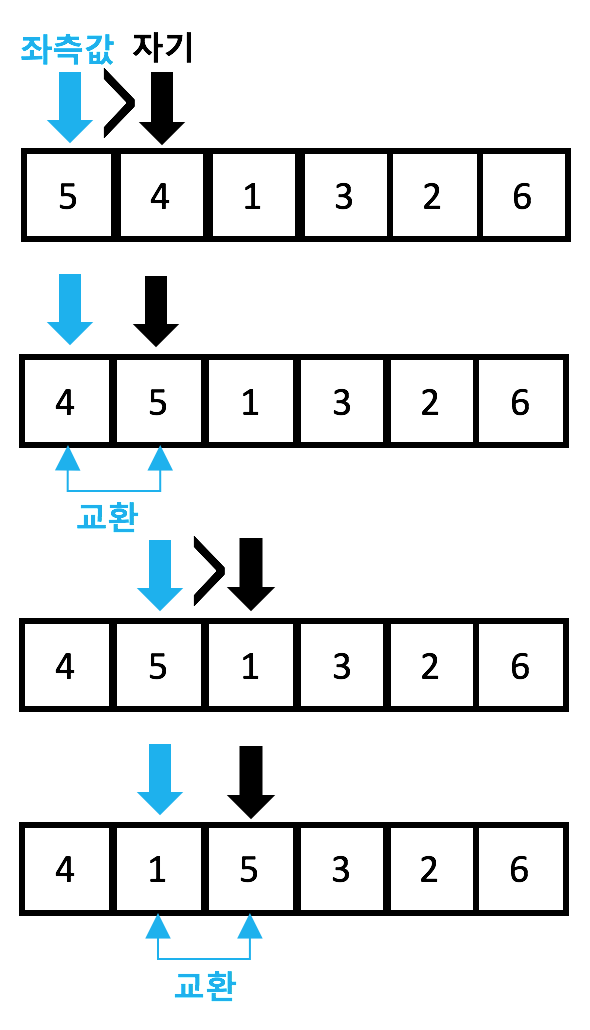 인접한 두 수를 비교하여 왼쪽값이 자신보다 크면 교환하는 정렬