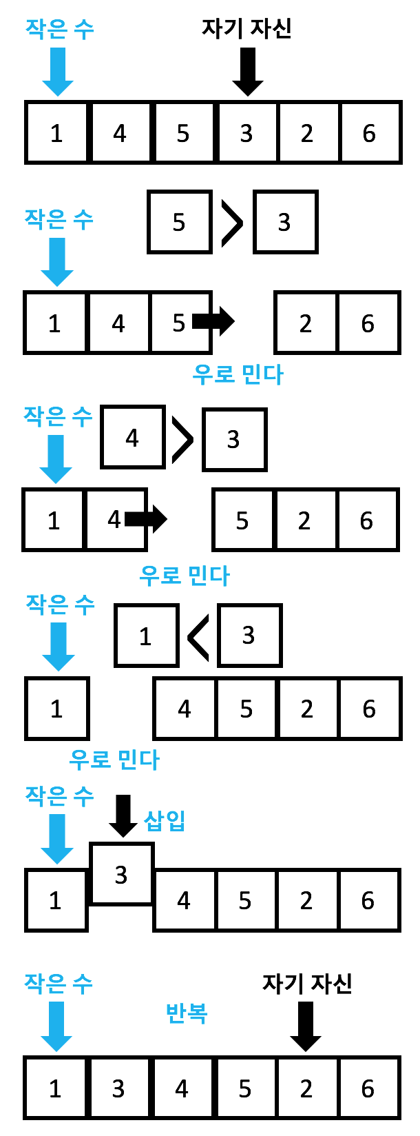 자신보다 작은 수가 나올 때 까지 오른쪽로 밀어 삽입하는 정렬