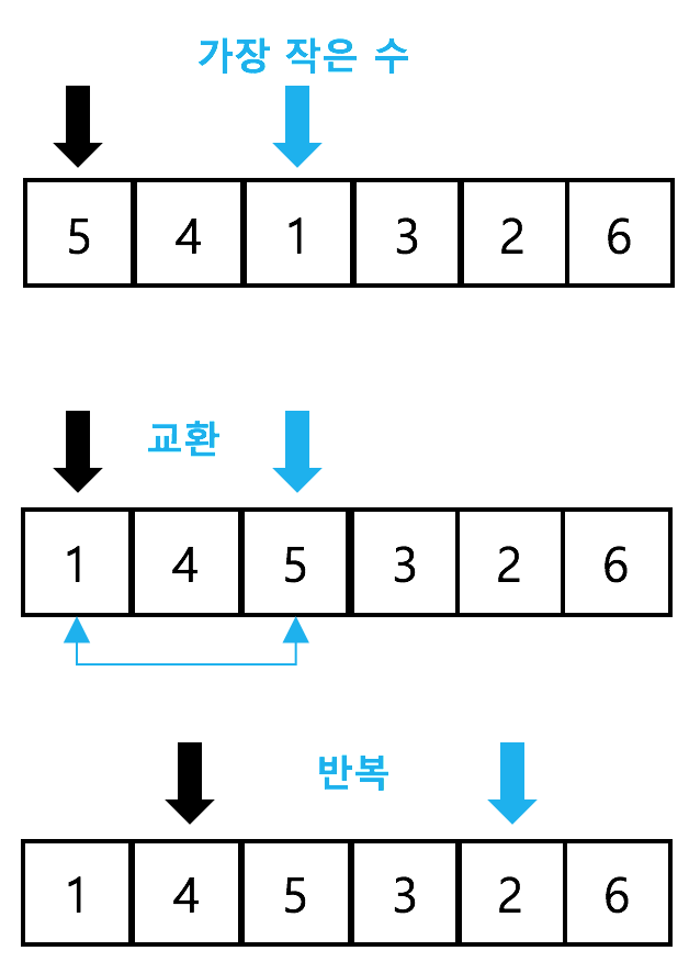 순차적으로 가장 작은 수를 선택하고 교환하는 것을 반복하는 정렬