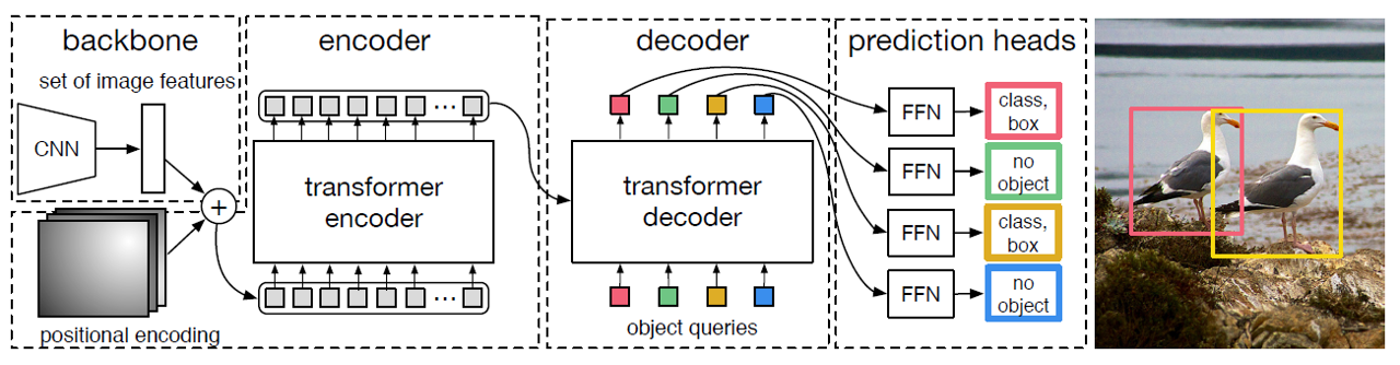 - Feed-Forward Network(FNN): 각각의 object query가 FNN을 거쳐 박스와 클래스 라벨("객체 없음 또는 배경"이라는 특수 클래스 포함)로 변환됨.