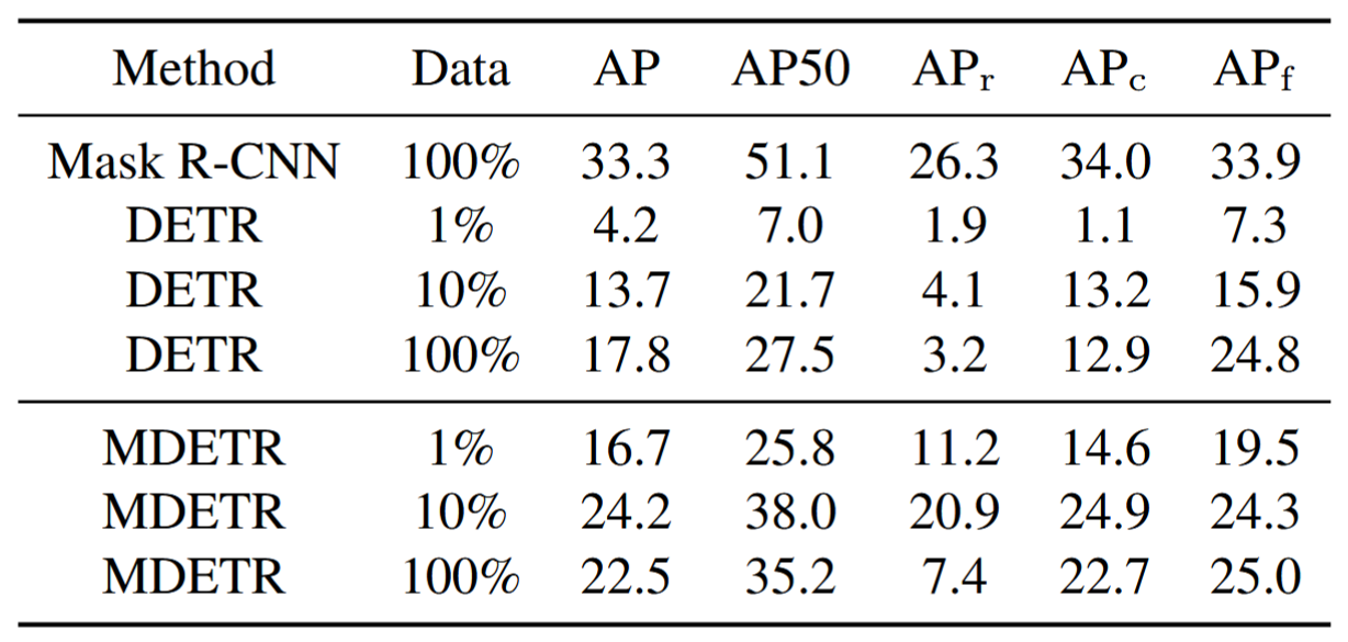 Few-shot 세팅: LVIS 학습 데이터셋의 1%, 10%, 100%만 사용해 학습 실험