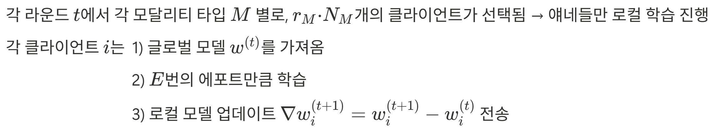 문제점: 유니모달 클라이언트는 자기 모달리티 데이터만 학습 가능, 다른 모달리티 정보 활용 불가능.