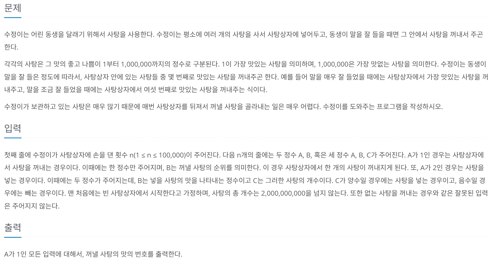 맛 별로 사탕이 몇 개인지를 세그먼트 트리로 관리해주고, 몇번째 사탕이 무슨 맛인지는 이분 탐색을 통해서 찾았다.