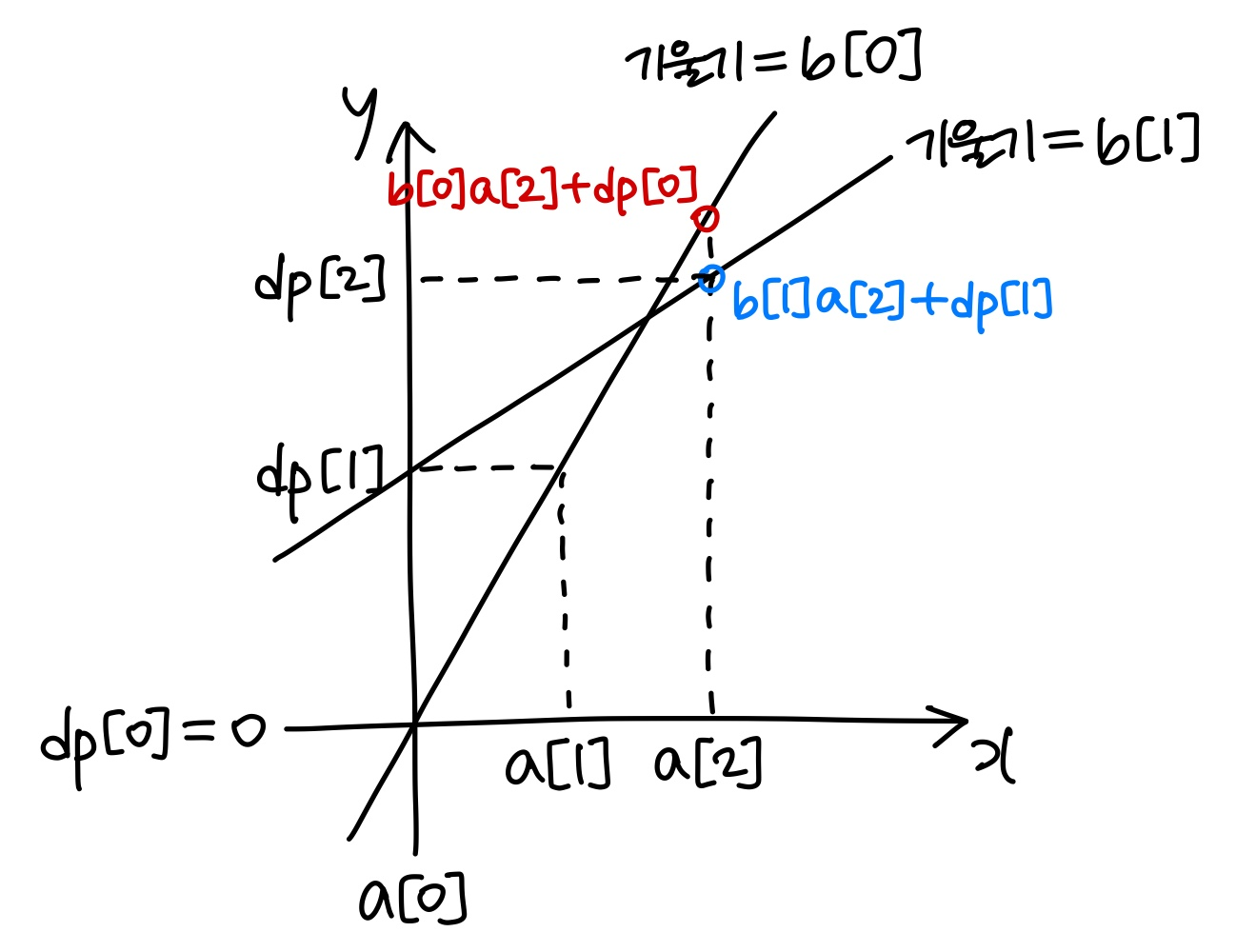이제부터 b[j]가 기울기이고, a[i]가 대입하려는 x값이고, dp[j]가 y절편인 직선을 생각해보자.