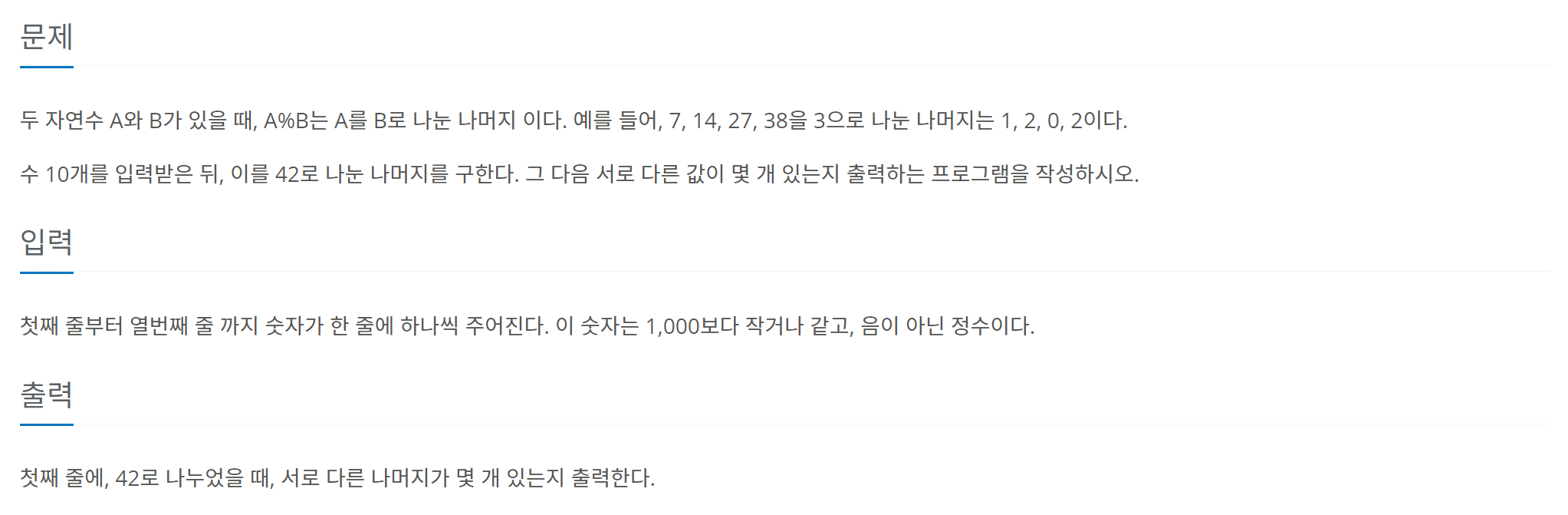 리스트에 42개의 0을 채워놓고 해당하는 나머지가 나오면 그 값을 1로 바꿔준다. 1이 있는 개수를 세서 해결! (정답)