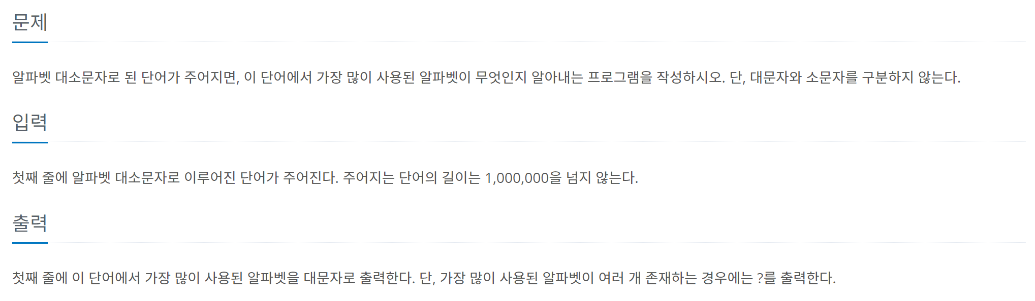 예전에는 문자열의 각 문자들을 원소로 하는 리스트를 만들 때 data = list(input()) 을 썼는데, 생각해보니 그럴 필요가 없었다. 애초에 파이썬에서는 문자열이 문자의 리스트의 형태로 취급되기 때문에 data = input() 이라고만 해도 data[0] 이런식으로 인덱스를 활용할 수 있는 것이었다... 암튼 아스키 코드로 변환 후 숫자를 보고 대문자인지 소문자인지 체크하고 카운트 했다. 그 중 최댓값을 우선 찾고 최댓값과 같은 값이 하나인지 여러개인지 체크했다. 좀 비효율적인 것 같긴 하지만... (정답)