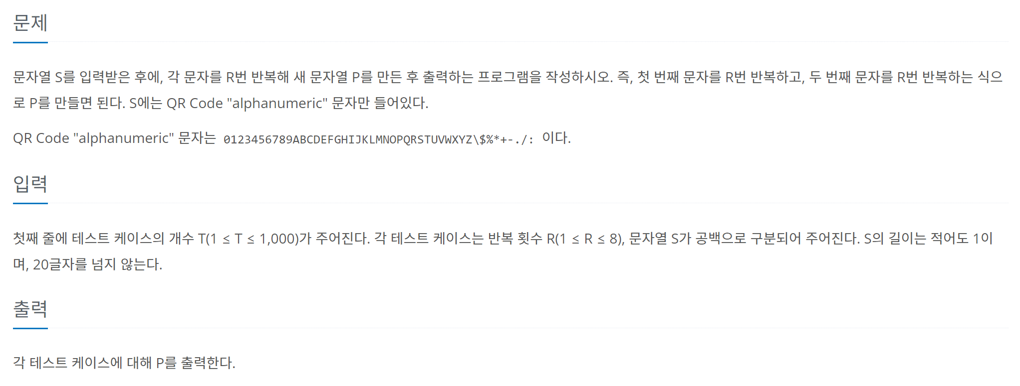 입력을 보면 한줄에 문자 개수랑 문자열이 같이 나와있어서 어떻게 할까 했는데, 문자열에 * 하면 되는 거 까먹고 이중 반복문 쓸 뻔 했다!! (정답)
