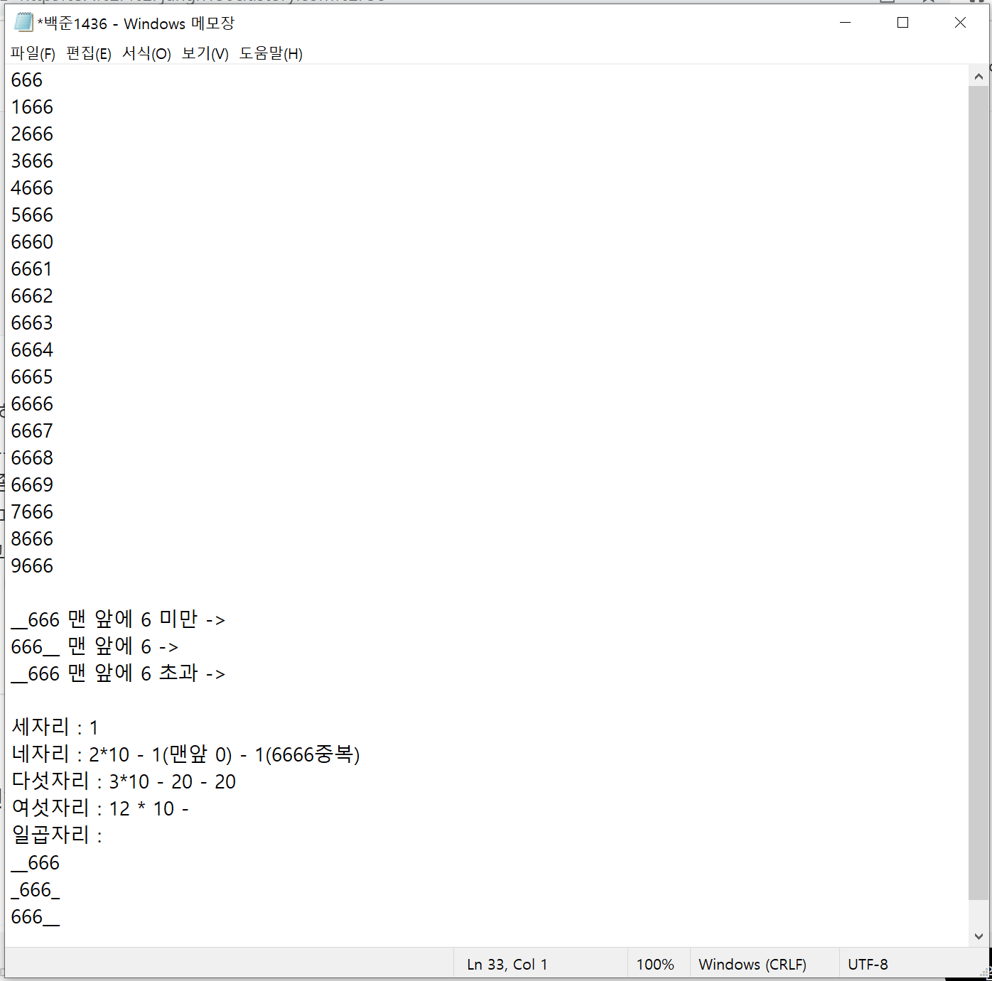 처음에는 규칙을 찾으려고 했다. 도저히 숫자를 1부터 시작해서 하나하나 체크하기에는 시간 초과가 나올 것 같았기 때문이었다. 근데 진짜 경우의 수까지 나오고 맨 앞에 0이 나오는 경우랑 세면서 중복되는 경우까지 전부 고려해줘야 하고 암튼 진짜 머리가 터지겠는 거임... 그래서 좀 찾아보니 이 문제는 사실 시리즈물이고 영화감독 숌 1, 2, 3, 4 까지 있었다. 그리고 1 이후의 골드, 플래티넘 문제들이 아마 그렇게 규칙을 찾아서 풀어야 되는 문제들이 아닐까.. 싶다. 이 문제는 알고리즘 분류에 브루트포스라고 적혀있기도 했고 실버5이니까 (심지어 시간 제한도 2초이다.) 하나하나 체크해가며 푸는 문제가 맞는 듯 하다. 굉장히 비효율적인 코드 같지만... 몰라 풀었으니까~~ (정답)