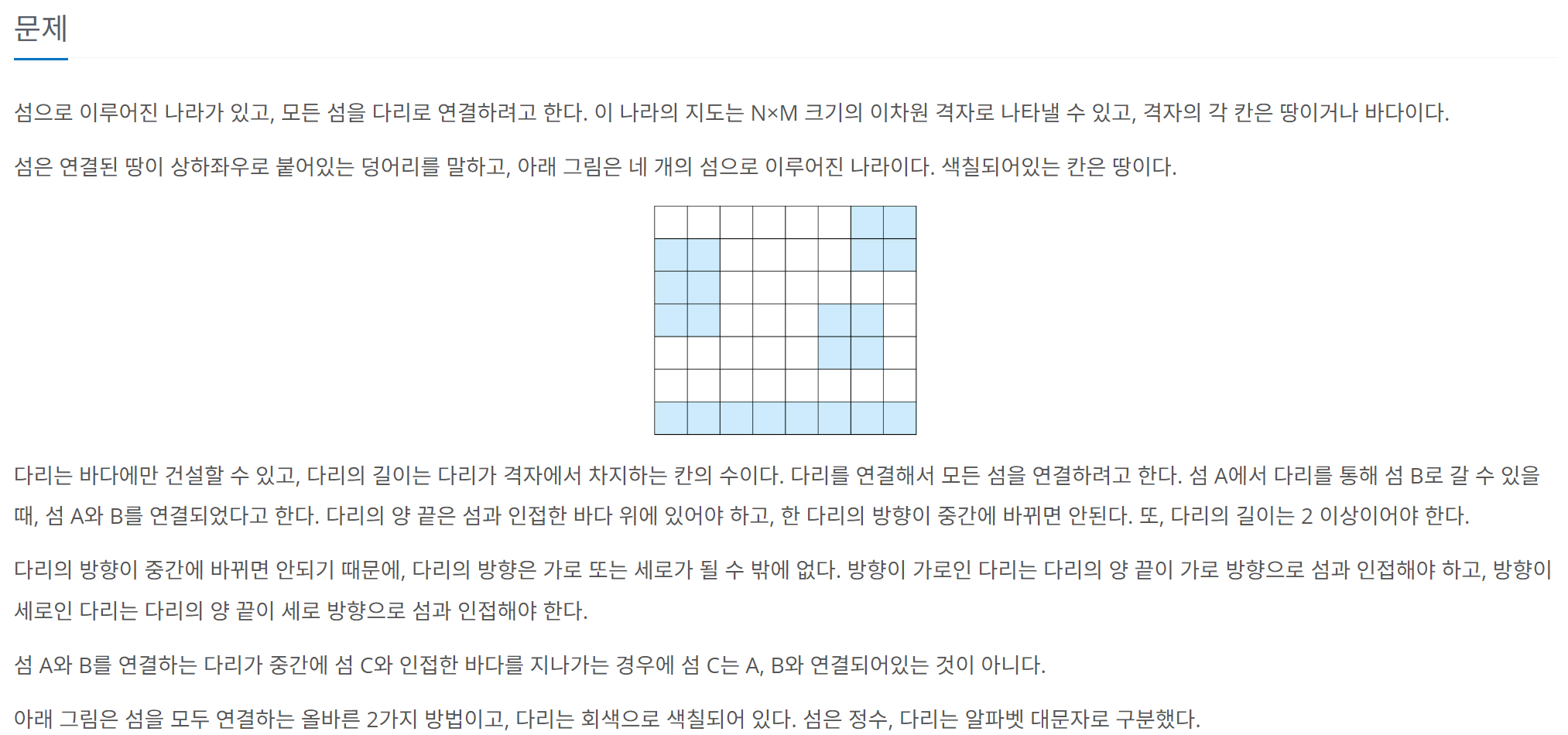 엄청 이것저것 할 게 많고 과정이 많아서 힘들었던 문제. 우선 섬을 그룹화해야하는데 이중 for문을 돌면서 0이 아닌 점을 만나면 bfs를 수행해서 같은 섬끼리 같은 번호를 갖도록 하였다. 그 다음에 이중 for문을 두번 돌면서 각각 가로 도로와 세로 도로를 체크했다. 첫번째로 섬을 만나면 pre값만 바꿔주고 두번째 이후로 섬을 다시 만나면 pre에 저장해뒀던 전 섬까지의 거리를 구해서 거리가 2 이상이면 에지 배열에 넣도록 하였다. 마지막으로 프림 알고리즘을 이용해서 최소 신장 트리를 구했다. 처음에는 모든 섬이 연결하는 것이 불가능하면 -1을 출력해야 한다는 조건을 고려하지 못했다. 그 후 isPossible 변수를 이용해 체크하고 출력하도록 했다. (정답)