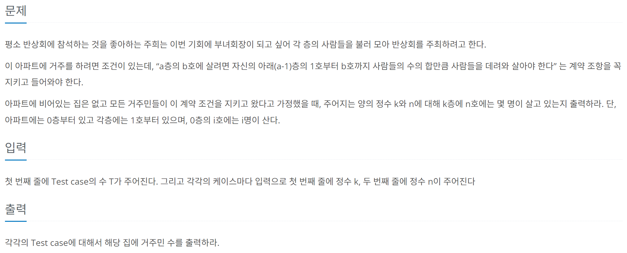 078. 부녀회장이 될테야 (백준 2775번)